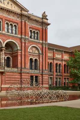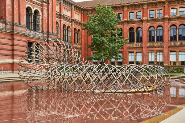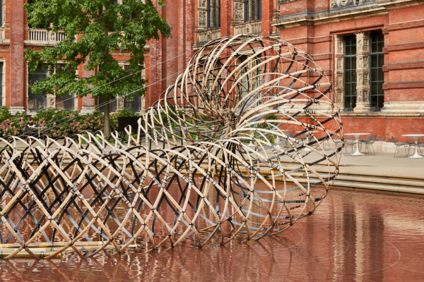 Inspired by the John Madejski Garden and curated by Clare Farrow, the doughnut-shaped structure – like a nest or cocoon – was created by weaving rings of bamboo and carbon fibre together. For Kuma, working with Ejiri Structural Engineers and the Kengo Kuma Laboratory at The University of Tokyo, the installation was an exploration of pliancy, precision, lightness and strength: by pulling two ends, it naturally de-formed and half of the woven structure was lifted into the air.