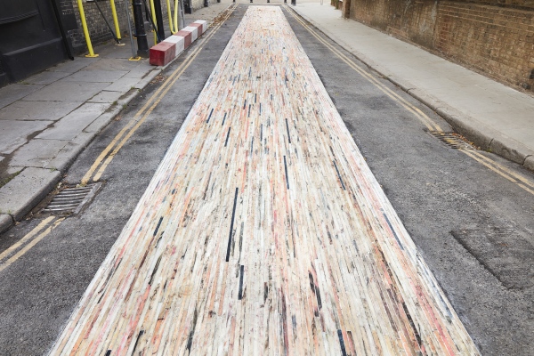 Co-curated by London Design Festival and Lisbon-based experimentadesign, and designed by Michael Anastassiades Studio in partnership with Portuguese quarry marble companies Mármores Galrão and Dimpomar, a secluded street in Southwark has been paved in a carpet of recycled marble.